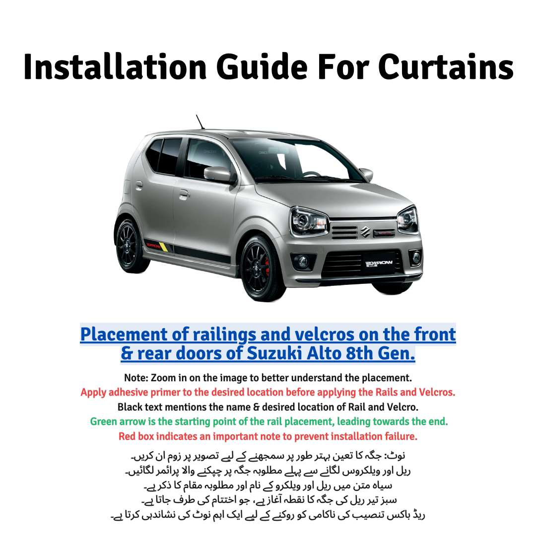 Enhance the interior of your Suzuki Alto 8th Generation with our premium car curtains, designed to elevate your driving experience to new heights. These car curtains strike the perfect balance between style and functionality, providing privacy, UV protection, and an added touch of sophistication to your vehicle’s interior. Whether you’re embarking on a road trip or commuting daily, these curtains will transform your driving space into a more comfortable and stylish haven.